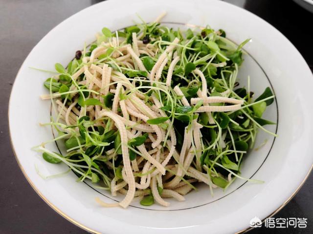 买好的豆腐丝切成段儿,香椿苗(芽苗菜)洗净控干水分拦两刀,把两者放一起,放入适量橄榄油就能吃了,其他什么调料都不用放,因为豆腐丝本身就是咸的,只放橄榄油可以吃出香椿苗的香味和鲜味,既有营养味道还特别好。