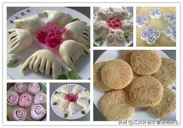 (2)因不同用料而形成品种多样化。如:麦类制品中有面条、蒸饺、锅贴、馒头、花卷、银丝卷等,米粉制品中的糕类粉团有凉糕点、年糕、发糕、炸糕等品种。