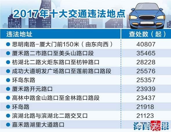 从厦门交警那边了解到,2017年厦门主要交通违法行为是“在禁止停车的道路上停车”,2017年共有141.5万多起。而交通违法行为高发地则是思明南路-厦大大南校门前150米(由东向西)。