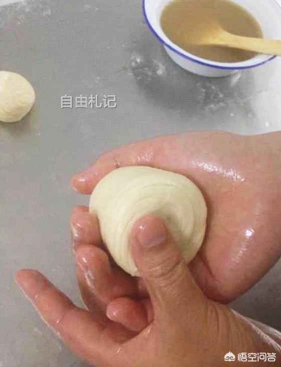 10、用擀面杖的一头压剂子的边缘,再用手整成凹状的形似小碗的面团,放在用平底锅或电饼铛上,凹面朝上。放饼时候,力气不大不小刚刚好的把饼摔在锅里,不是用放的,这样才正宗。