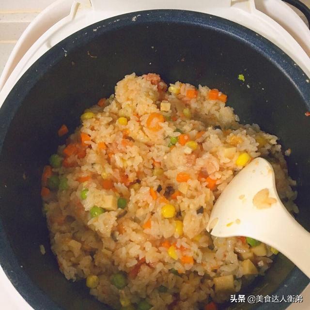 4:将切好的食材丁放入饭锅中,就可以开始蒸饭了。米饭正好后,将食材搅拌均匀既可。美味的网红饭就做好了。