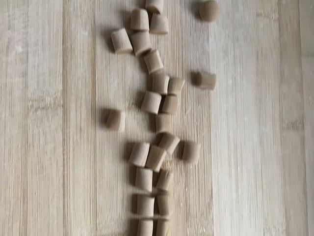 5.戳成长条切成等份小剂子,小剂子再揉成小长条,搓成长细条是为了更小,珍珠奶茶的珍珠就是要小小的,太大容易煮不熟,而且口感不好;长细条切成小丁丁,小颗粒表面撒木薯粉。