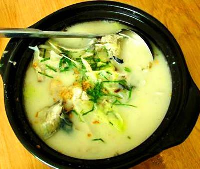 3、原锅汤汁烧开,去葱、姜,加入盐、火腿片,倒入鱼头汤碗内即成。