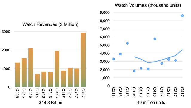 (Apple Watch 销售额以及销量的变化情况,图片来源:Asymco)