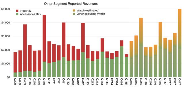 两个季度之后,Apple Watch 正式开卖,跟 iPod 一样,这个全新的品类也被归到了财报的「其他」项里。短短两三年间,在苹果财报那个不为人知的角落里,Apple Watch 正在取代 iPod 的位置。