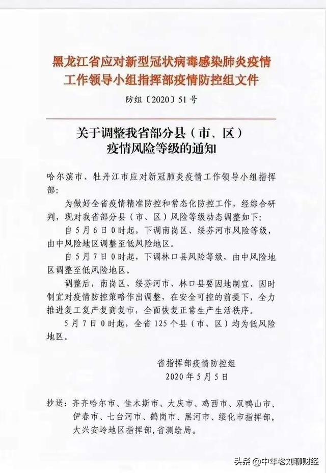 自此,自5月7日0时起,黑龙江全省125各县(市、区)均调整为低风险地区。