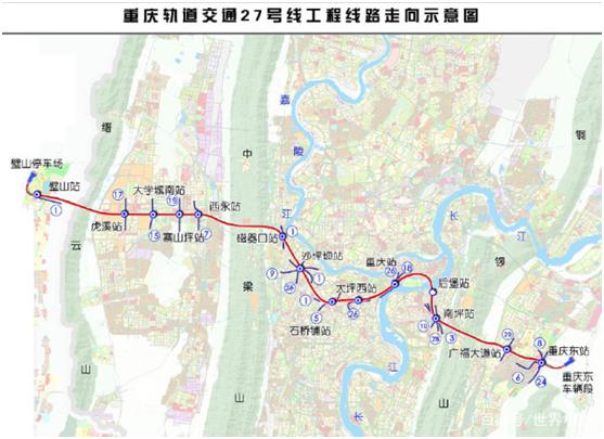 据悉,27号线从璧山站首发,经虎溪站、大学城南站、寨山坪站、西永站、磁器口站、沙坪坝站、石桥铺站、大坪西站、重庆站、后堡站、南坪站、广福大道站,终点为重庆东站。线路全长51.829公里,设车站14座,其中高架站1座,为璧山站,其余13座均为地下站。