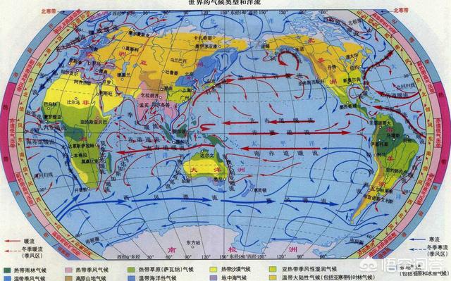 气压带风带是形成气候的重要因素,包括赤道低气压带、低纬信风带、副热带高气压带、盛行西风带、副极地低气压带、极地东风带和极地高气压带。由于海陆分布的差异,气压带和风带经常被切断,我国位于亚欧大陆和太平洋之间,海陆热力性质差异明显,从而形成了典型的季风现象,我国是世界上季风气候最为显著的地区,拥有包括热带季风气候、亚热带季风气候和温带季风气候。由于,我国位于大陆东岸地区,所以盛行西风带难以影响到我国,盛行西风带主要影响大陆西岸地区,比如亚欧大陆的西部地区,西临大西洋,盛行西风带由西往东带来大西洋的水汽。