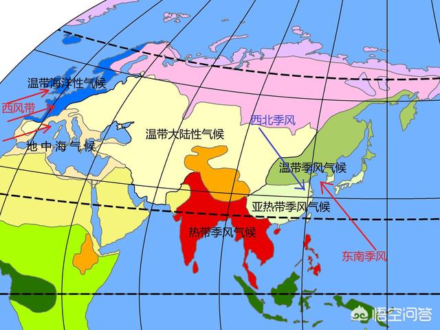 欧亚大陆东岸,我国南方与之相对应地中海地区的纬度,却发育着亚热带季风气候,与之对应大陆西岸的温带海洋气候发育着温带季风气候,