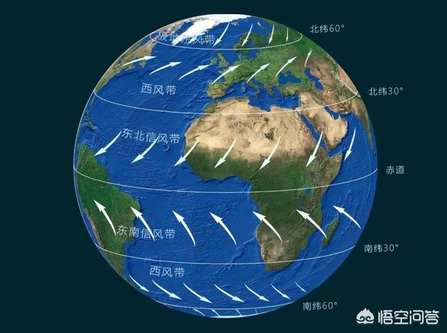 根据三圈环流的特点,从赤道到极地分别分布着赤道低压带、信风带、副热带高压带、盛行西风带、副极地低压带以及极地东风带,其中南北纬30度到南北纬60度之间的近地面被盛行西风带控制。