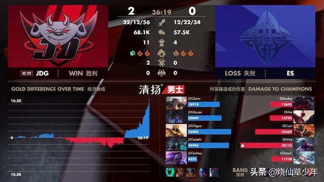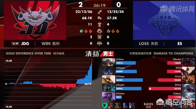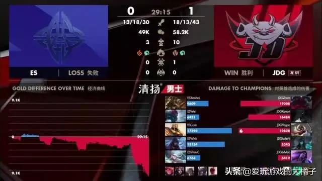 简单回顾下ES对战JDG的这两局比赛,在第一局游戏中,两边在前期打的其实比较均势,两边打的有来有回互不想让,人头和经济基本持平,JDG战队经济小领先一些。最终JDG依靠大龙逼团,ES战队打野想抢龙被集火秒掉,之后JDG以多打少,打赢团战拿下第一场比赛胜利。