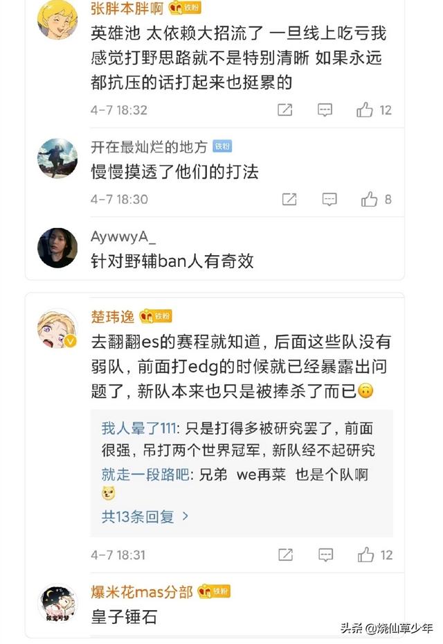 怎么说呢就感觉ES让我想起了第一代RW侠以及之前的TOP,就他们刚进LPL的那一段时间很猛,但是后来被大家慢慢的研究以后就知道怎么打他们了,而且这种新队往往会有一个致命的缺点,那就是队伍一旦连败的时候没有老将能出来稳住军心,至于ES是不是伪强队,我想等常规赛的后面几场比赛就能看出来了!