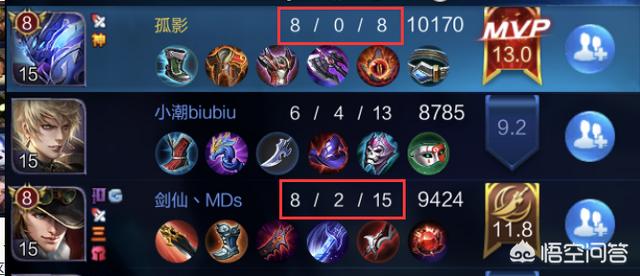 这把剑仙的马可波罗没的说,人头和孤影一样多,助攻比孤影的白起多一倍,但可惜的是,剑仙的马可阵亡了两次。王者荣耀的KDA是这么算的击杀+助攻加起来去除阵亡次数来计算,一般KDA最高的人会获得MVP,不像KPL的比赛一般都是由专人评选出当场比赛的MVP。