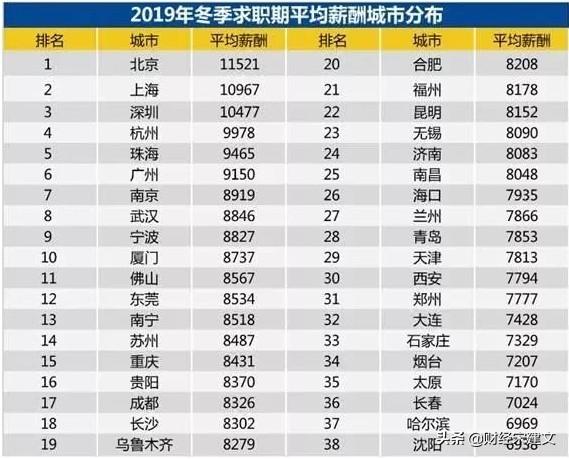 根据某招聘网站2019年冬季薪酬报告数据显示,2019年第四季度全国38个主要城市的平均招聘薪酬为8800元,其中北京平均招聘薪酬11007亿元,排名第一,上海平均招聘薪酬10534元,排名第二。