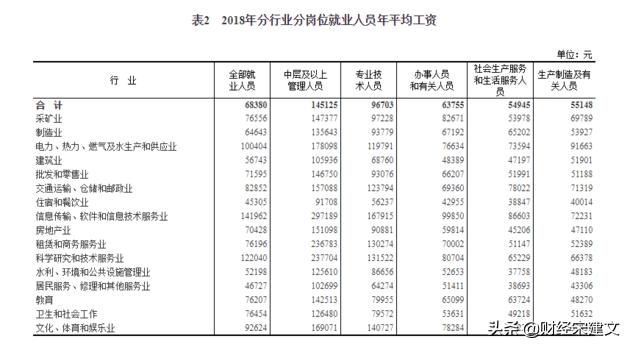 较低的长春为7024元、哈尔滨6969元、沈阳6938元,也都在6000元以上。当然这个数据并不能反应整体情况,只反应了通过互联网渠道求职数据,并且有一定的季节性因素,那我们再看一个数据,统计局公布的2018年(2019年数据未公布)各行业分岗位的工资情况: