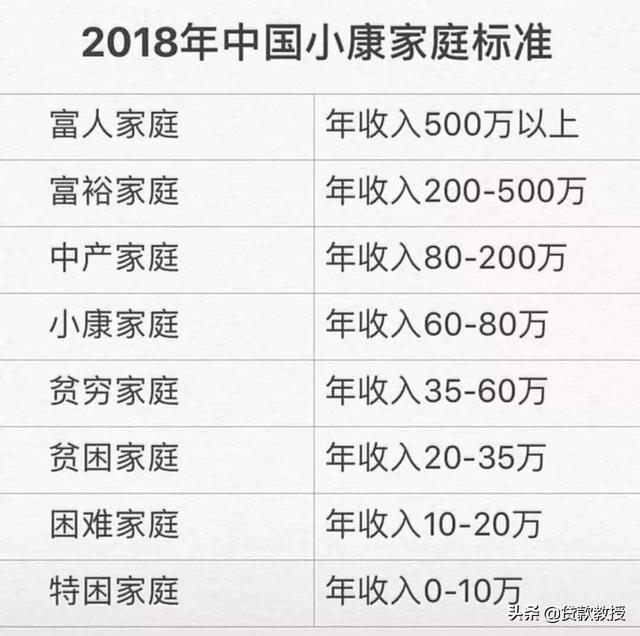 按照网上所流传的这个标准,年收入低于10万块钱的家庭算是特困家庭了,即便年收入低于35万都算是贫困家庭,而一个小康家庭的年收入至少需要达到60万以上。