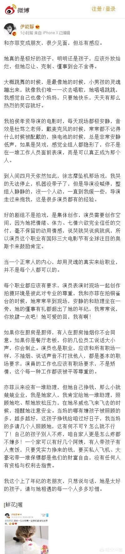 伊能静在微博千字长文力挺刘亦菲称其是个好孩子。