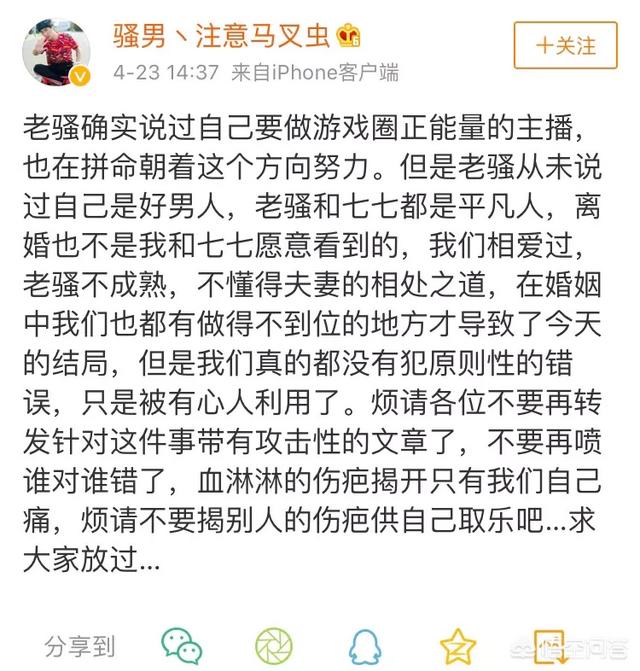 虎牙知名LOL直播骚男与七七突然离婚,对此你怎么看?