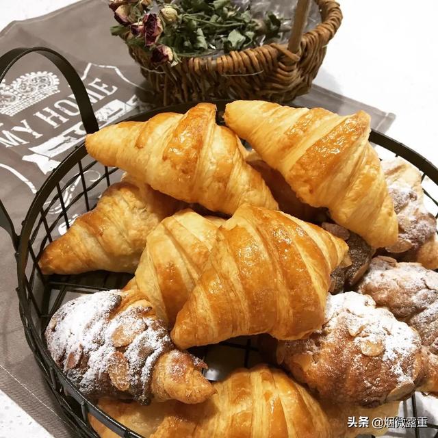 1.材料:干酵母 1又1/3小匙 高筋面粉 180克 低筋面粉 20克 糖1大匙 蛋 1个 温水105克 盐1/2小匙 麦其琳(植物黄油,包入用)100克 牛奶适量(刷面包表皮用) 2.酵母溶于温水,与高筋面粉,低筋面粉,糖,蛋,盐混合在一起,揉成面团 3.包上保鲜膜,放温暖潮湿处发酵至2-2.5倍大. 4.将麦其琳用保鲜袋装起来,用擀面棍将起敲打几下,再擀成较规则的四边形 5.桌上洒面粉,将发酵好的面团擀成一块面片,长度是擀好的麦其琳的三倍,宽度比其略宽一点就好. 将麦其琳放在面片中间,两边的面片折过来,将其包裹.将两头捏紧,这样,麦其琳就包好在面片里了. .用保鲜膜包好,放入冰箱冷藏室松弛20分钟 6.取出松弛好的折叠面片,桌上洒干面粉,擀开成一面片,将其三折,包上保鲜膜,再次入冰箱松弛10-15分钟;如此总共反复三次. 最后一次三折后,入冰箱松弛20-30分钟.取出,擀成一个0.3CM厚的面片. 7.整理形状:将面片用轮刀分成三角形的面片,底边中间切一道切口,将面片从底部卷起 8.排上烤盘,刷一层牛奶.放温暖潮湿处做最后发酵. 9.发酵完毕,(手摁面团,无弹性即可),烤箱预热190度,上下火,烤箱中层,20分钟左右,表面上色足够即可.