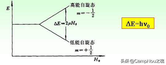换言之,当原子核吸收ΔE的能量后,便产生共振。由低能态向高能态跃迁。所以,为了产生共振,可以用一定频率的电磁波照射。所以又有公式ΔE=hv0。当体系吸收一定的电磁波能量后,也会跃迁。如上图黄色公式所示,h为普朗克常数,v0就是电磁波频率。