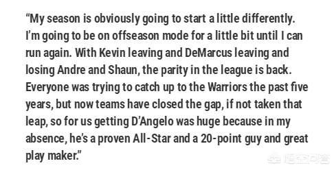 克莱-汤普森的原话是:“很明显我们的下赛季会完全不同。我们的休赛期对阵容进行了很大的调整,KD离开了、考辛斯离开了,伊戈达拉与利文斯顿也离开了,联盟的平衡似乎回来了,在过去的五年里,每支球队都想追赶勇士队,如今各队终于拉小了差距,在这种时刻我们得到丹吉洛是具有巨大意义的,在我无法付出前他会证明自己是一个超级明型、一个伟大的组织者,一个场均20分的家伙。”克莱-汤普森说的很清楚,勇士队变弱了,KD、考神、伊戈、利文的离开让勇士变弱了,各队拉近了跟勇士的距离,联盟的平衡回来了。