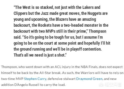 最后克莱-汤普森表达了对西部各支豪强的看法,他表示金州勇士队在下赛季依旧是一支季后赛球队,他的原话为:“西部是如此的强大,不仅仅有湖人和快船,爵士也得到了极大的补强(康利与博扬),掘金年轻的双核即将展现天赋,开拓者有惊人的后场组合(利拉德+CJ),火箭组建了后场双头怪,两个mvp还在巅峰期,所以这对我们(勇士)来说是很艰难的,但我认为我会在某个时刻复出,希望我能帮助球队成功,我们将继续在季后赛中进行竞争。”克莱-汤普森数出了西部7支豪强:湖人、快船、爵士、掘金、开拓者、火箭加上勇士就是7支,而勇士在这样的西部中依旧是季后赛球队,等到他复出后勇士依旧会在季后赛去进行竞争。