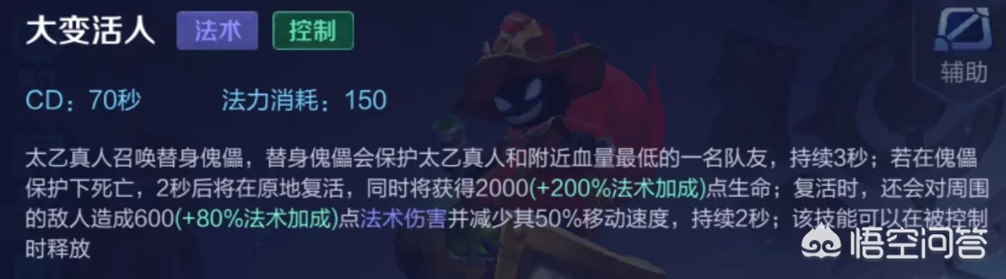 大招施展后,本身与周围友方血量最低的英雄在3秒内死亡的。2秒后复活,如果本身与与血量最低友方单位同时失亡,那么双方都有效。这在本赛季游戏体验中真心是一个大的Bug,特别是法装的太乙复活几乎接近满血。
