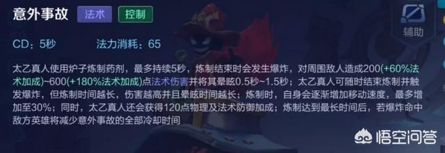 这是一个群体增益bug,是所有辅助技能中堪称最强。持续的金币加成给了太乙更多的时间游走,在S10赛季太乙是唯一可以全场游走支援,但在经济上不落下风的英雄。第一技能:意外事故