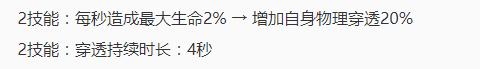 二技能增加20%的物理穿透效果,持续4秒!这个改动实在是太变态了,配合破甲弓的护甲减免,这个护甲减免可以达到惊人的65%。