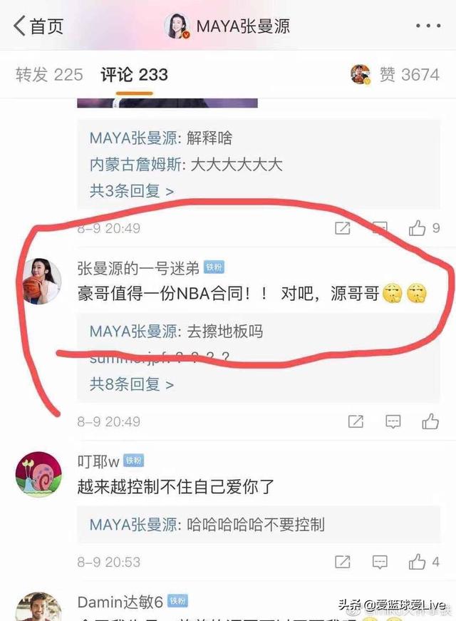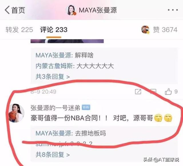 8月9号,张曼源的一条微博瞬间炸开了锅,因为她这条微博公开diss林书豪。有球迷问她:豪哥值不值得一份NBA合同?谁也没想到她竟然回答:“去擦地板吗?”