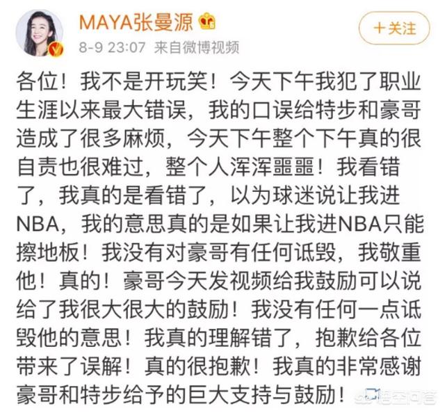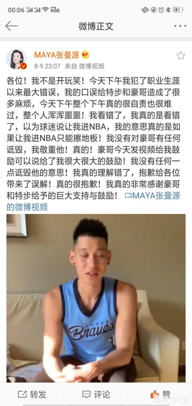 刚看到这个微博,本人也很纳闷,按理说,张曼源的情商不会这么低,林书豪人缘这么好,应该也不会和谁有过节。正在准备diss张曼源的时候,她大晚上终于发了条解释的微博。原来,她就是看错了而已,她浑浑噩噩地把豪哥看成了源哥,以为球迷是在问她能不能打nba。
