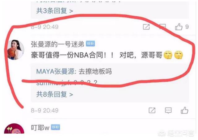 张曼源在活动结束当天发了一条微博,随机就有他的一位铁粉,名称为张曼源的一号迷弟留言说“豪哥值得一份NBA合同,对吧,源哥哥”,可没想到张曼源在下方的回复却是“去擦地板嘛”,这条回复瞬间引起了球迷的热议,虽说林书豪现在并没有NBA球队想要签下他,可以他的实力来说,再怎么着也不会去擦地板,况且她这样说未免有些落井下石的味道,或许是发现了什么,她赶紧把这条回复删掉了,可惜还是躲不掉网友的手速截图。