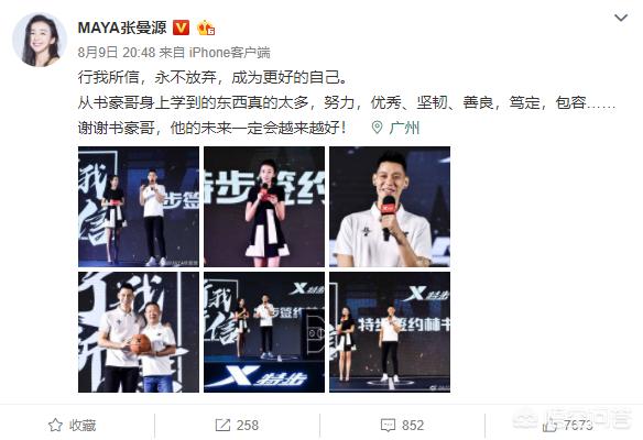 事情还要回溯到8月9日,当天张曼源发布了一条微博,这条微博是林书豪被国内某一运动品牌签约的事。她在微博上晒出与林书豪的多张合照,并且赞美了林书豪,还感谢了他。可以看到,当时张曼源是发布会的主持人。