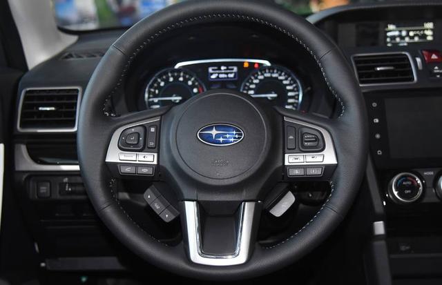 方向盘设计非常端正,T字形外观有很多按键,标配了方向盘换挡和加热,斯巴鲁的车标还是比较有意思的,蓝底再配上六颗白星。