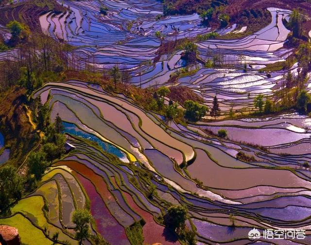 3月正是放水期,注满水的梯田,层层叠叠的像镜面般,空中俯瞰特别壮观。