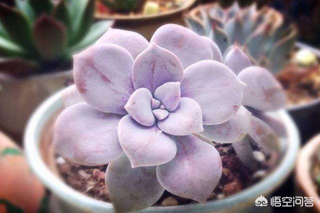 紫乐和华丽风车虽然样子有点像,也是同科同属,但它们不是同一种多肉!紫乐,又叫紫悦,是景天科风车草属的多肉植物,其茎粗壮直立生长,叶片倒卵形,交互生长,非常肥厚,叶面平整或略凹,叶背有龙骨状凸起,前端近三角形,急尖并带有短叶尖,被一层薄薄的白粉,整个植株呈不太紧密的莲座状,平常叶色为灰绿色,在光照充足温差较大的环境下出状态为紫红色。