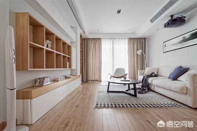 用不对称的装饰储物柜代替了传统的电视背景墙,又能放很多书,简约吊顶的设计让客厅的进深、采光以及视觉效果都放大。客厅安装了投影仪与显示屏,也是家里的影音室,同时满足读者爱看书爱看电影的两大兴趣爱好。