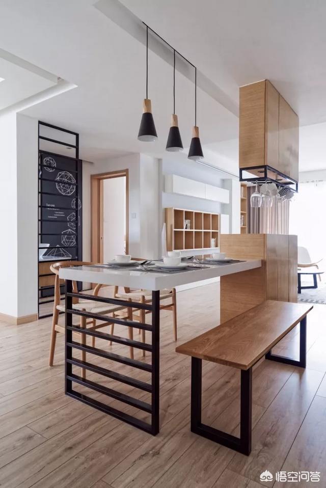 木质椅子 和长板凳的搭配,一方面是为了搭配得趣,一方面可以容纳更多的人。吊柜与鞋柜结合做成的吧台尤其独特,做这个吊柜前先做的吊顶里已经加固过一圈龙骨,所以工人直接沿着吊顶里的龙骨吊下来。