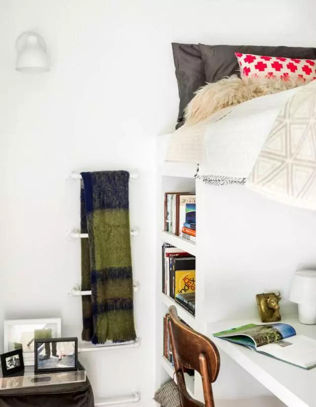 如果地面空间比较小,但天花的高度较高的空间,可以选择高脚床,在床的下方可以增加工作区或是收纳空间。但这个方法并不适合所有的人,因为必须每天爬上爬下,如果不介意这样的方式的人可以考虑使用高脚床,因为这样可以改变整体空间的设计。