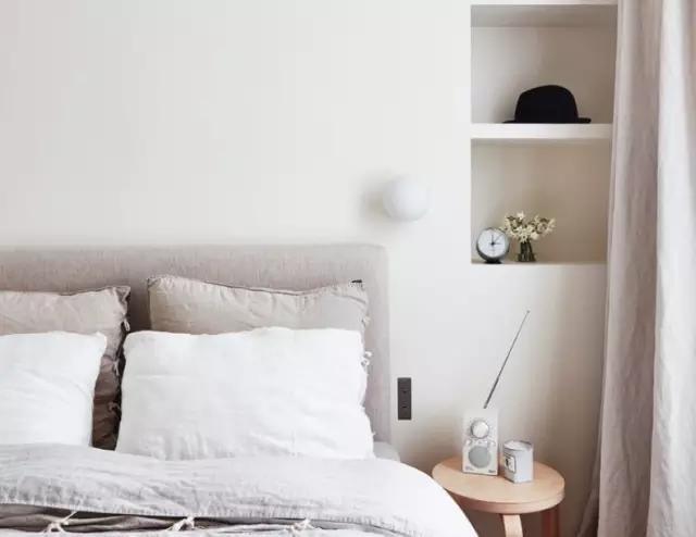 比较新的建筑物,通常石膏板都会选择空心的,如果你的床所靠的墙非外墙时,可以考虑在墙面上切出壁龛,壁龛不需要很深,只需要放置闹钟或是生活小物品的宽度即可。