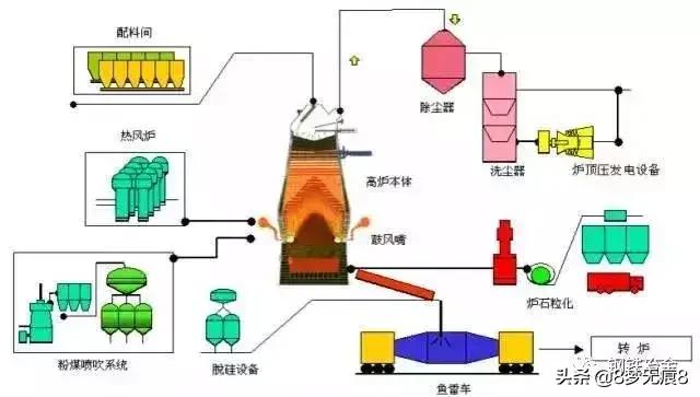 在高炉冶炼中,大概可以分为八个系统。 有高炉本体系统,卷扬上料系统,供料系统,冷却系统,喷吹系统,渣铁处理系统,送风系统,除尘系统等