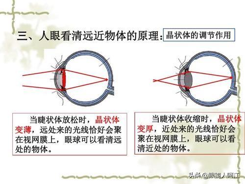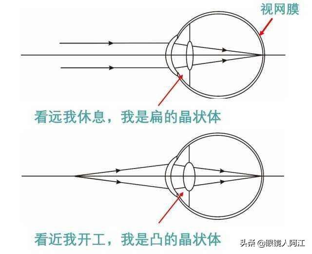 人眼观察外界物体时,在睫状肌作用下改变水晶体曲度,以保证视网膜上得到一个清晰视象的过程。人在看较远的物体时,眼球的水晶体较为扁平,看近的物体时,水晶体较为凸起。