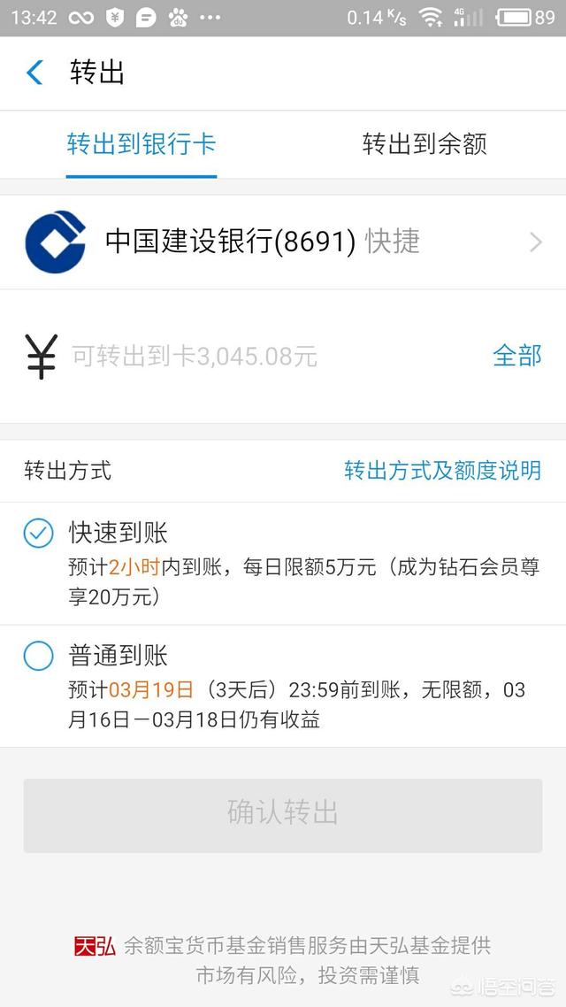 2. 余额宝转出到卡提供快速到账和普通到账服务。