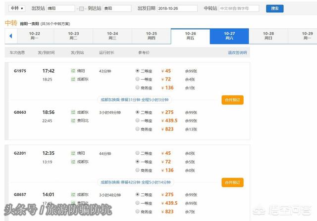 如图所示,坐高铁在成都转车很方便,有30多趟选择,两趟高铁之间只需要等待少则半小时,多则1、2个小时的时间,全程最短只需要5个小时,绵阳到成都东二等座票价45元,成都东站到贵阳北站二等票价275元,合计320元。