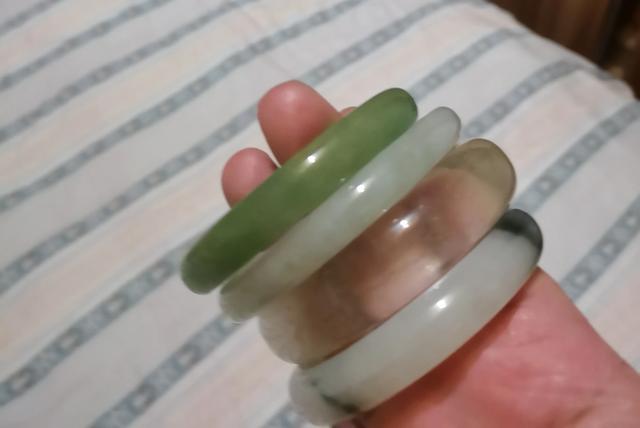 我会捡漏的,我之前在一卖翡翠老板那里打工,学到了一些翡翠知识。对翡翠虽谈不上有多专业,但还是学会了大概的估价,毕竟要和客户进行一些简单交谈。下面的手镯除了第一图是我老婆婆送的,其它都是十多年前的捡漏。