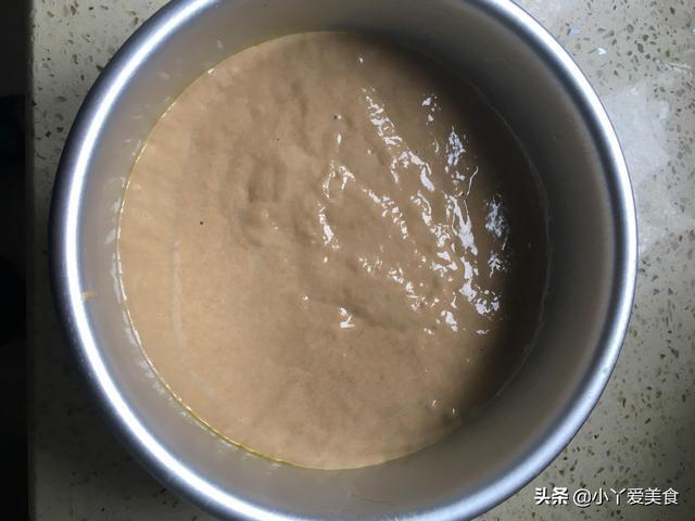 4,盆里抹油,把面糊倒入,盖上盖子,放到温暖处发酵,发到发糕爬起来到模具8分满即可