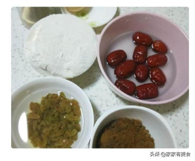 食材:面粉300克、酵母4克、红糖80克、鸡蛋1个、开水220克、大枣适量
