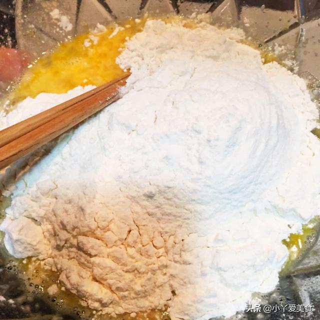 4.200克面粉中加入提前化好的红糖水和两个鸡蛋搅拌成糊状。