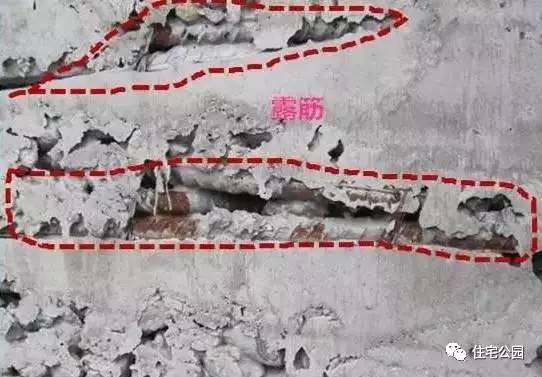 现象:混凝土内部主筋、副筋或箍筋局裸露在结构构件表面。