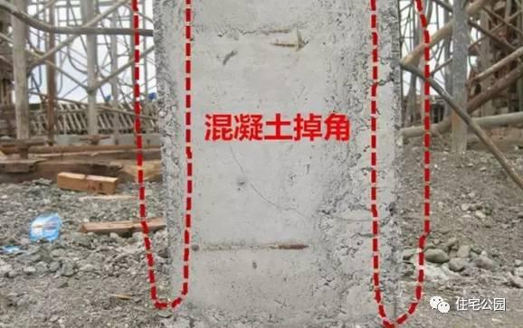 现象:梁、板、柱、墙及洞口直角处混凝土局部掉落,不规整,缺棱掉角。